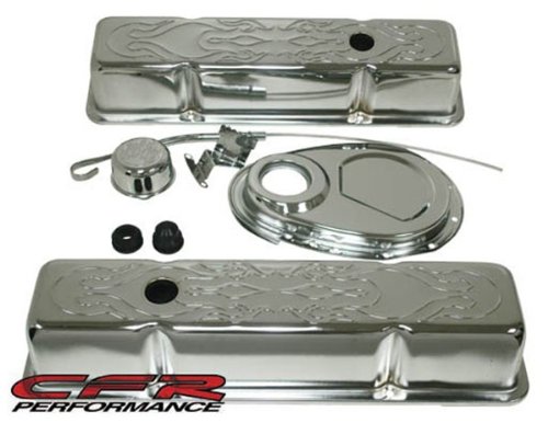 - Chevy small block flamed chrome steel engine dress up kit fits 1958-1986 Chevy 283-305-327-350 small block engines.- 1 pair of flamed baffled tall style chrome steel valve covers.